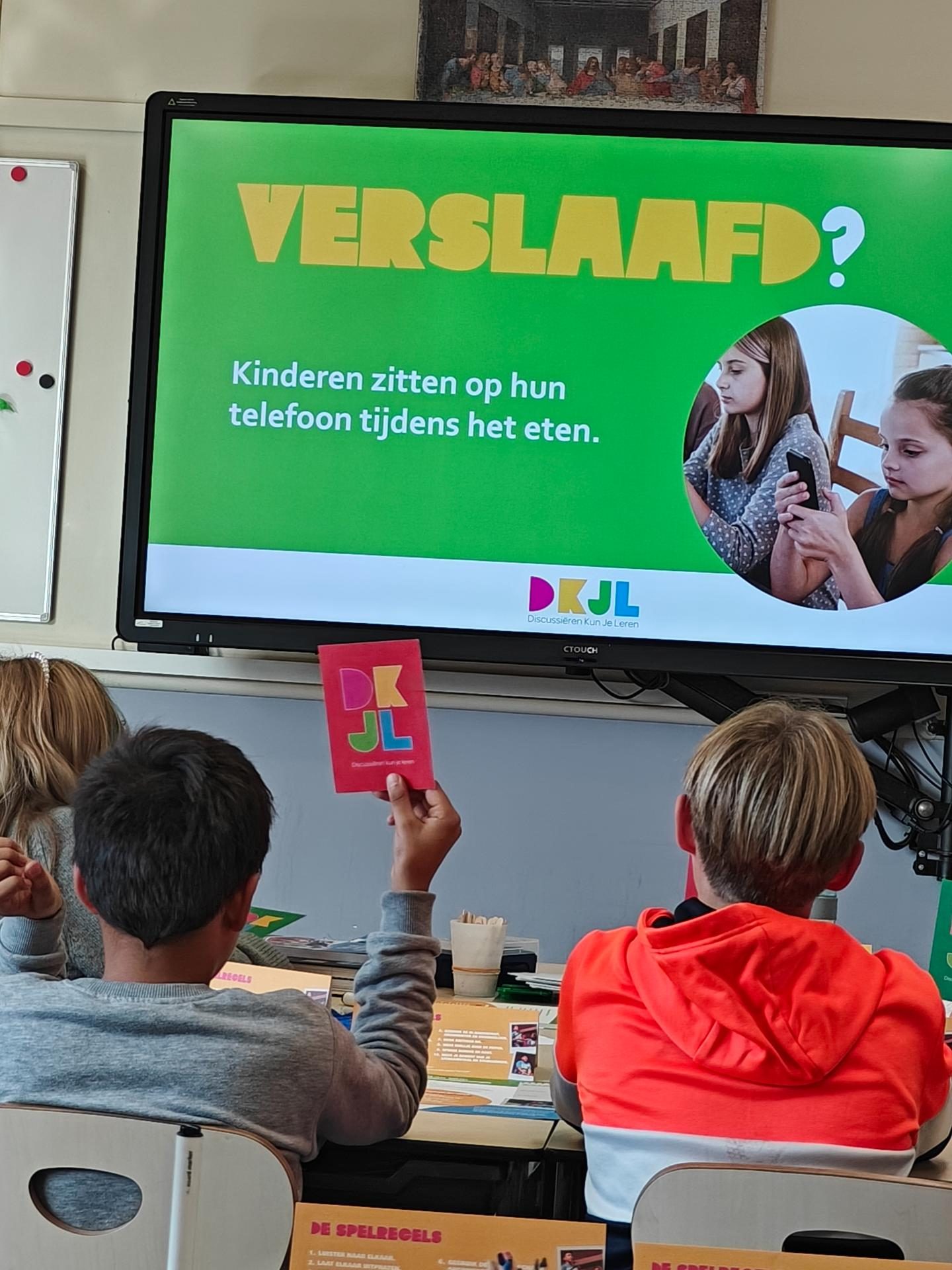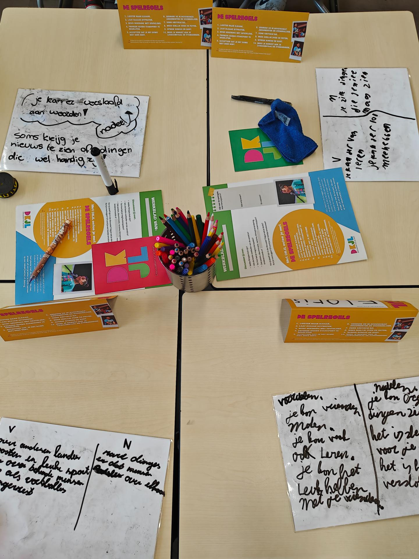 Terwijl de leerlingen langzaam binnendruppelen na het buitenspelen, bereidt Sara van Discussiëren Kun Je Leren de materialen voor die tijdens de debatles worden gebruikt. Het is de tweede les die zij aan deze groep geeft. Binnenkort volgt de derde en laatste les, waarin de leerlingen één debatheld kiezen die de school zal vertegenwoordigen tijdens de Debatbattle van Purmerend.