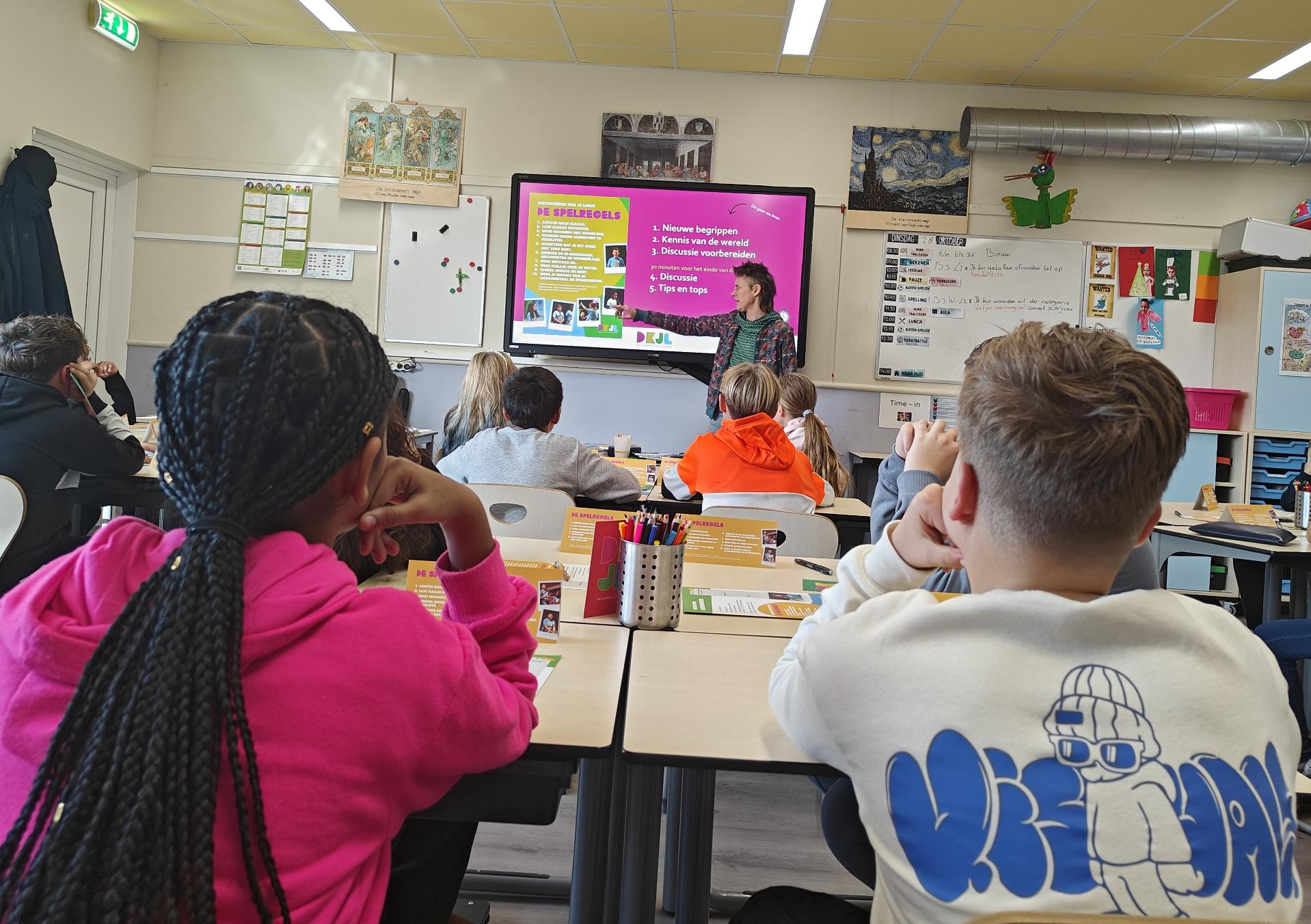 Terwijl de leerlingen langzaam binnendruppelen na het buitenspelen, bereidt Sara van Discussiëren Kun Je Leren de materialen voor die tijdens de debatles worden gebruikt. Het is de tweede les die zij aan deze groep geeft. Binnenkort volgt de derde en laatste les, waarin de leerlingen één debatheld kiezen die de school zal vertegenwoordigen tijdens de Debatbattle van Purmerend.