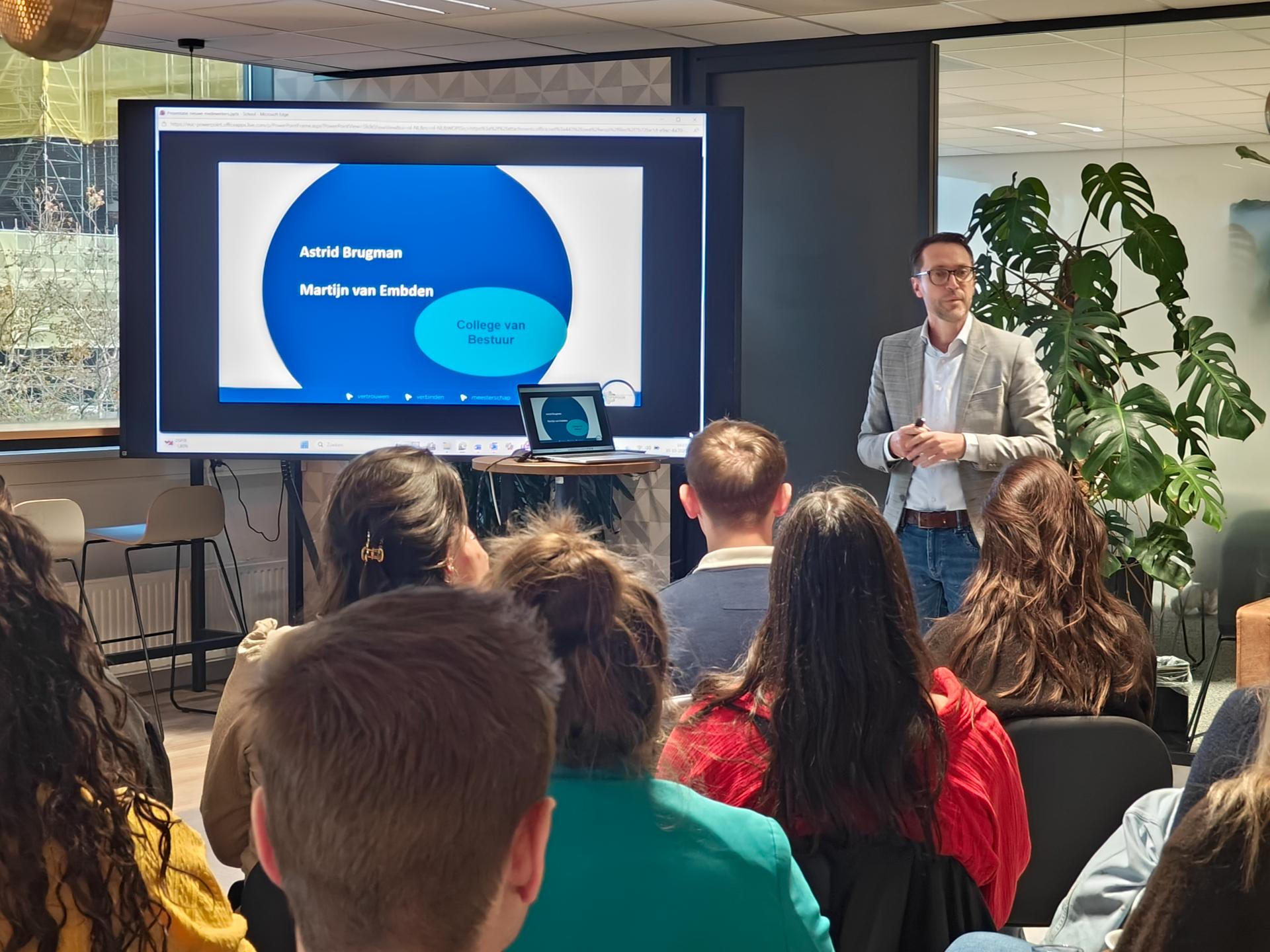 Voorzitter van het College van Bestuur Martijn van Embden nam de nieuwe collega's mee in de wereld van OPSPOOR en de ontwikkelingen die voor ons liggen. Daarna was het de beurt aan de nieuwe teamleden om te vertellen over de ervaring die ze meebrengen, waarin zij zich bij OPSPOOR hopen te ontwikkelen en hoe wij hen daarbij het beste kunnen ondersteunen. Ook gingen we samen in gesprek over de betekenis van TOEKOMSTMAKERS en wat hun visie op goed onderwijs is.